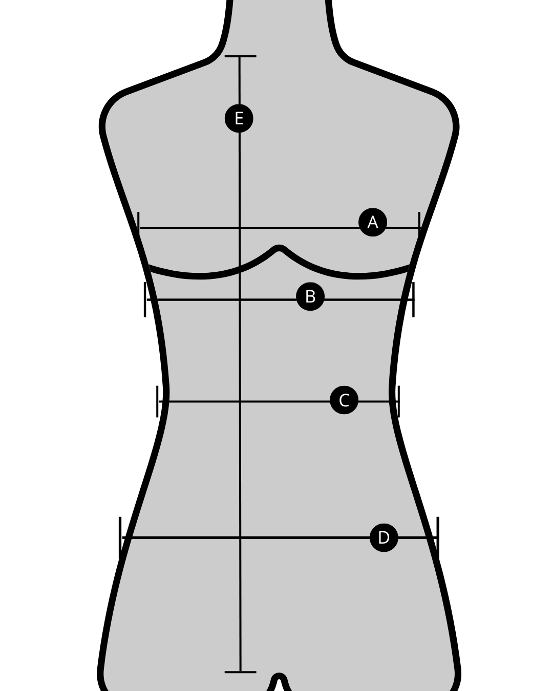 Tomar la medida desde el centro del pecho (coincidiendo con altura de hombros) hasta la mitad de la entrepierna, manteniendo una postura derecha.